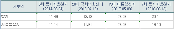 2014 지방선거 사전투표율은 11.49%, 20대 총선 사전투표율은 12.19%, 2017 19대 대선 사전투표율은 26.06%, 2018 7회 지방선거 사전투표율은 20.14%의 투표율을 보입니다.